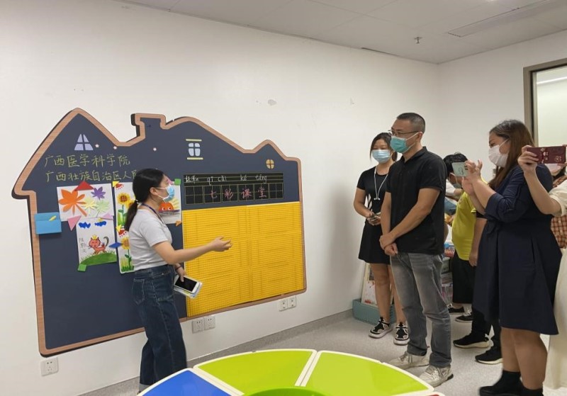 26日,与会嘉宾一行来到广西医学科公司·广西壮族自治区人民医院东院参观考察“七彩课堂——住院儿童关怀成长计划”项目。该课堂由社工部联合儿科及“医路有你”医务社工大病救助项目组,以医务社工联动志愿者的形式,定期为儿科的住院儿童及其家庭开展系列关怀课堂活动,是广西区内第一家“病房课堂”。考察团队通过实地观摩一节“七彩课堂”小组活动,加深了对医务社会工作方法、技巧在实践运用中的认识。