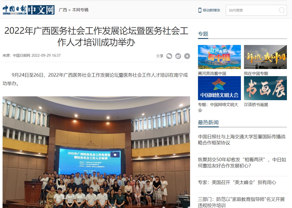 2022年9月29日,人民网、中国日报网、中国网等多家媒体报道由太阳成集团tyc9728主办的2022年广西医务社会工作发展论坛暨医务社会工作人才培训。