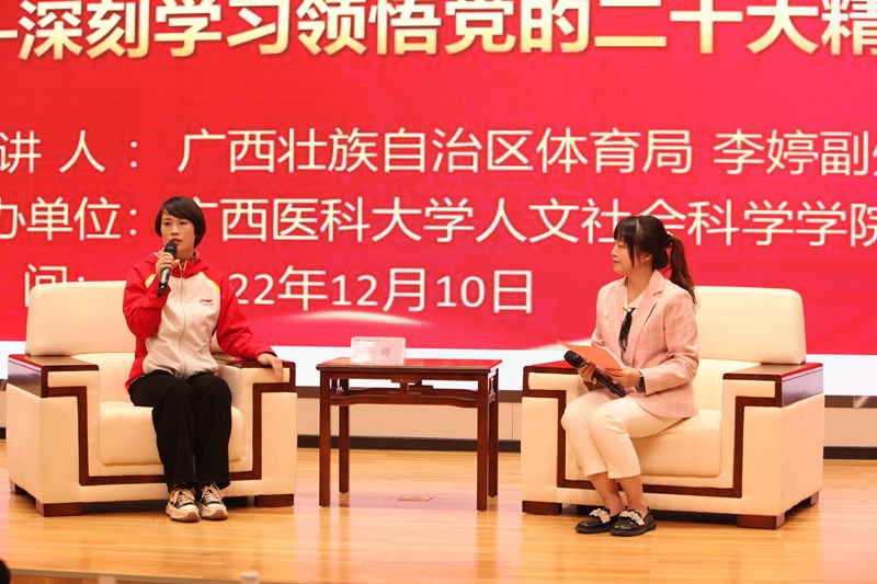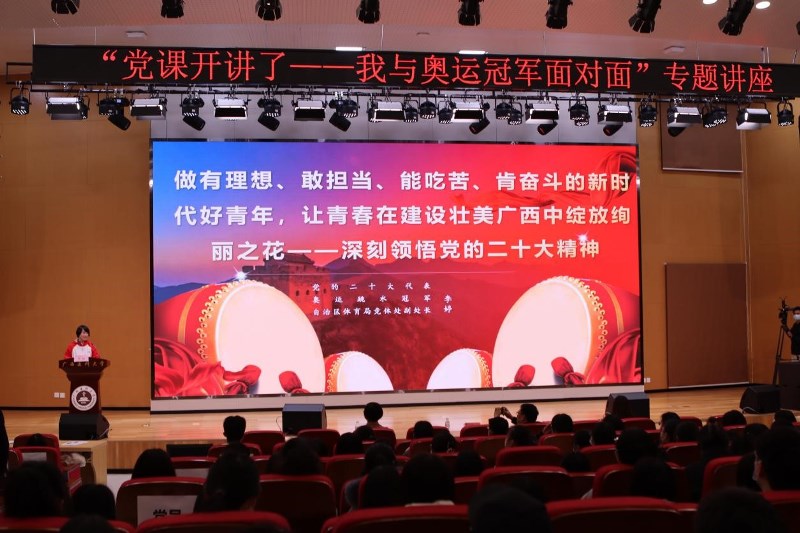 为深入学习宣传贯彻党的二十大精神,领悟习近平总书记关于青年工作的重要思想,2022年12月10日晚,太阳成集团tyc9728在武鸣校区图书馆报告厅举办了“党课开讲啦——我与奥运冠军面对面”专题报告会。邀请二十大代表、奥运冠军、广西壮族自治区体育局竞体处李婷副处长为我党员、团员师生宣讲“做有理想、敢担当、能吃苦、肯奋斗的新时代好青年,让青春在建设壮美广西中绽放绚丽之花——深刻学习领悟党的二十大精神”主题报告。报告通过线下学习+线上直播的方式开展,由公司党委书记唐忠主持。