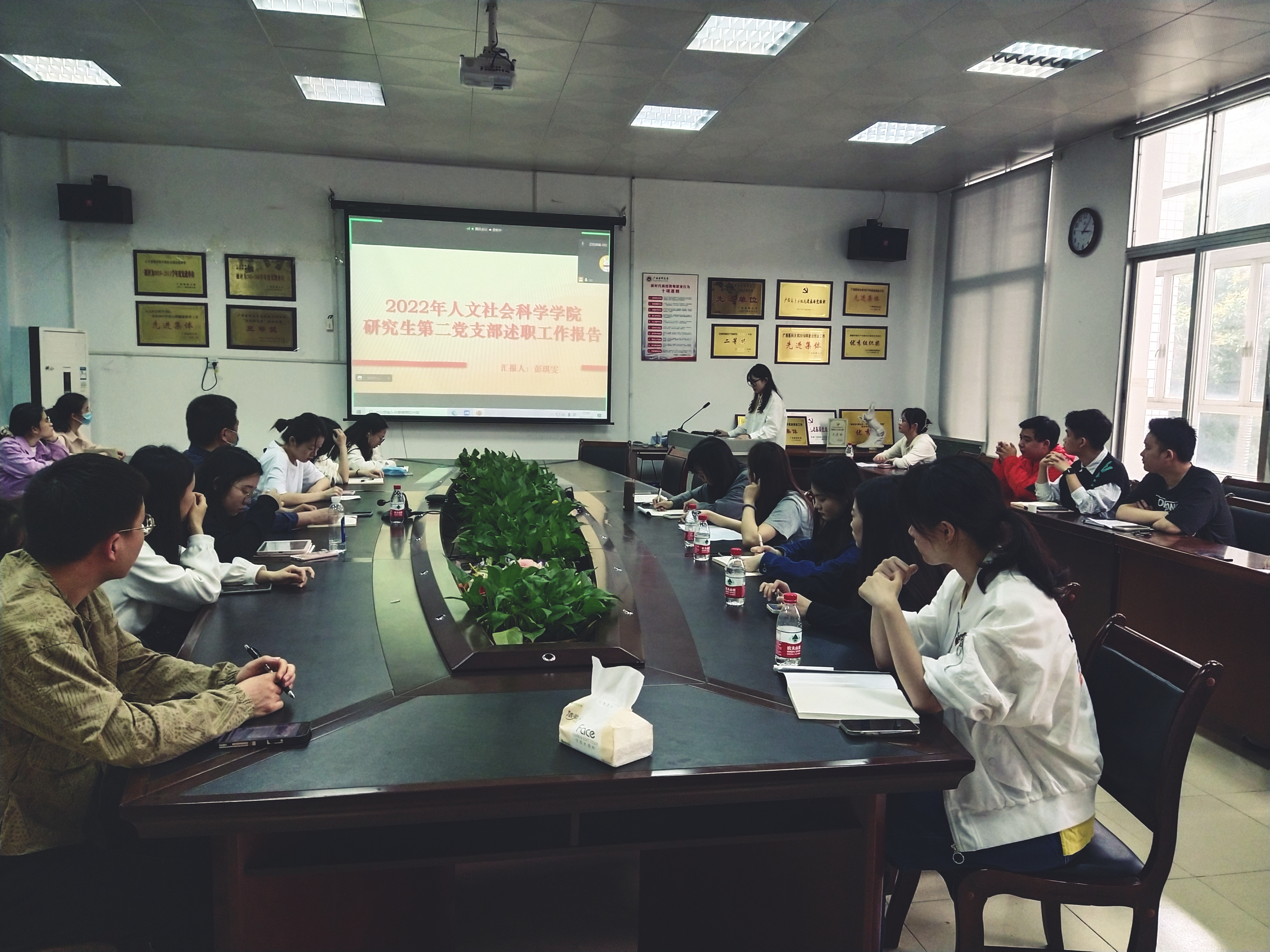 第二项议程为彭琪雯同志代表公司研究生党支部委员会述职。彭琪雯同志介绍了目前支部的组成、过去一年支委在工作中取得的成果以及存在的问题,并在此基础上对新一届支委的工作提出建议,希望新一届支委能克服之前存在的不足,并打造有特色、有亮点的品牌活动,把党支部建设成为凝聚力强,创新性高的优秀支部。