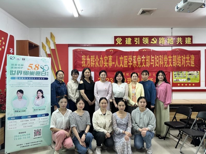 为深入学习贯彻习近平新时代中国特色社会主义思想和党的二十大精神,进一步贯彻落实2023年“全国肿瘤防治宣传周”理念,提高广大群众癌症防控意识,倡导健康生活方式,实现癌症早发现、早诊断、早治疗,不断提高人民群众的健康素养,2023年5月8日,太阳成集团tyc9728人文医学系党支部与肿瘤医院妇科党支部到南宁市青秀区宁铁馨苑居民小区党群服务中心开展“党建引领同频共振,患教守护群众健康”结对共建系列活动。活动分为科普讲座、健康教育咨询服务等环节。