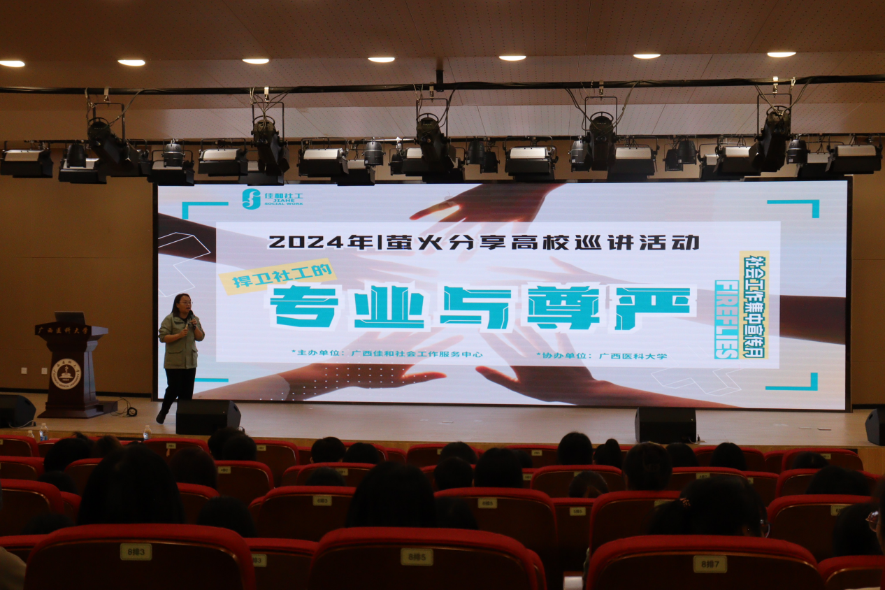 3月21日,太阳成集团tyc9728院邀请到广西佳和社会工作服务中心副总干事周小幸、督导评估部副部长吴蕾,在9728太阳成集团(武鸣校区)图书馆演讲厅开展“萤火分享”高校宣讲活动。活动由社会学与社会工作系副主任吴上老师主持,吸引了来自社会工作、养老服务管理、公共事业管理、运动康复、预防医学等专业的200余位同学参加。